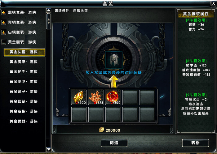 将可打造的装备拖动到打造框上,会呈现打造上古装备所需的材料。