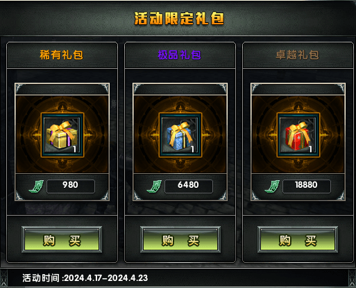 新区雷鸣废墟推出超高价值特别限定礼包,三种档位可供选择,每个档位都包含超高福利,特惠限定,仅可在开服期间购买。
