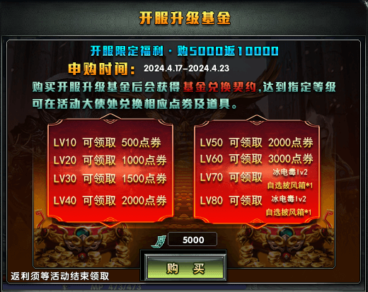 活动期间内购买开服基金,活动结束后可到【活动大使】处获得超值返利,每达到10、20、30、40、50、60、70、80级时都可领取不同数额的点券返还及珍稀道具,升级基金,助力成长,让坎特拉之路更加顺畅。