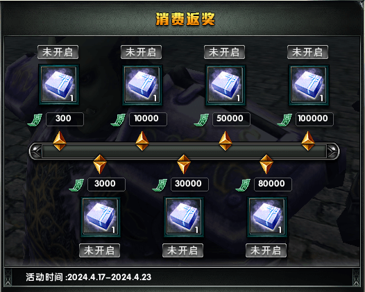 活动期间内消费点券达到指定数量可领超值返奖,共7阶消费礼包可供选择。