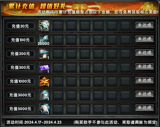 活动期间在新服进行充值,累计充值金额到达不同的档位可以获得不同的奖励。