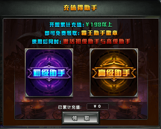 活动期间内累计充值金额超过198,即可免费获得霸王助手徽章,使用后可同时开启30天霸王初级、高级助手功能,包括自动修复道具耐久度、自动售卖、一键修理等功能。徽章不可重复获得,每人仅可获得一次。