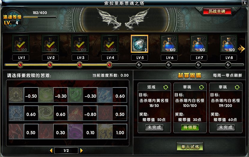 索拉里斯之塔主界面主要显示涤魂等级、奖励,救赎的苦难,弑罪恩赐(周常)、历史丰碑等相关信息;