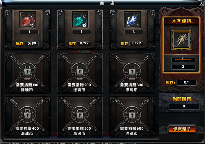 商店事件:可使用涤魂币购买商店内的道具,更多购买道具需要捐赠涤魂币开启,商店右侧会有一件超值道具,如果有需求千万不要错过