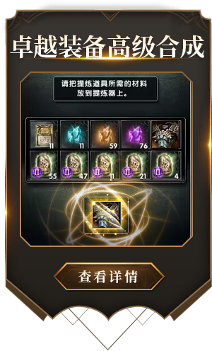 合成50级或以上卓越装备时可使用装备高级合成功能,通过消耗相应的辅助道具,增加装备各类型高级属性出现的几率,高级合成功能必须使用“精华卷轴”。